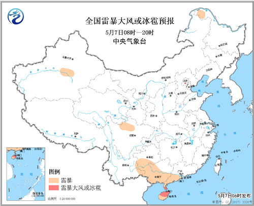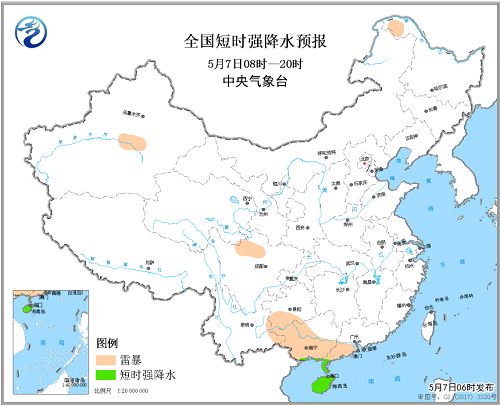 人民網(wǎng)北京5月7日電 據(jù)中央氣象臺(tái)網(wǎng)站消息,預(yù)計(jì)5月7日08時(shí)至8日08時(shí),貴州南部、廣西北部和東部、廣東西部、海南島等地的部分地區(qū)將有短時(shí)強(qiáng)降水天氣,小時(shí)雨量20-40毫米,局地可達(dá)50毫米以上;另外,海南島等地的局地可能有雷暴大風(fēng)或冰雹天氣。